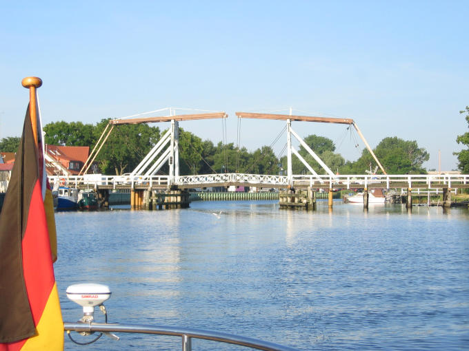 13.7. Zwar knapp, aber wir passen unter der Ryck-Brücke in Wiek hindurch